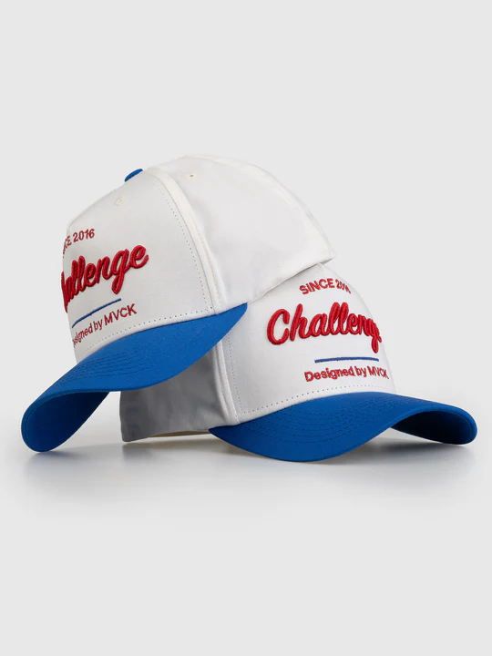 Moldável com 6 costuras. Boné Aba Curva Challenge Off Whitee Azul Posicionada ao lado esquerdo do fecho. Logo emborrachada sobreposta ao boné com acabamento premium.